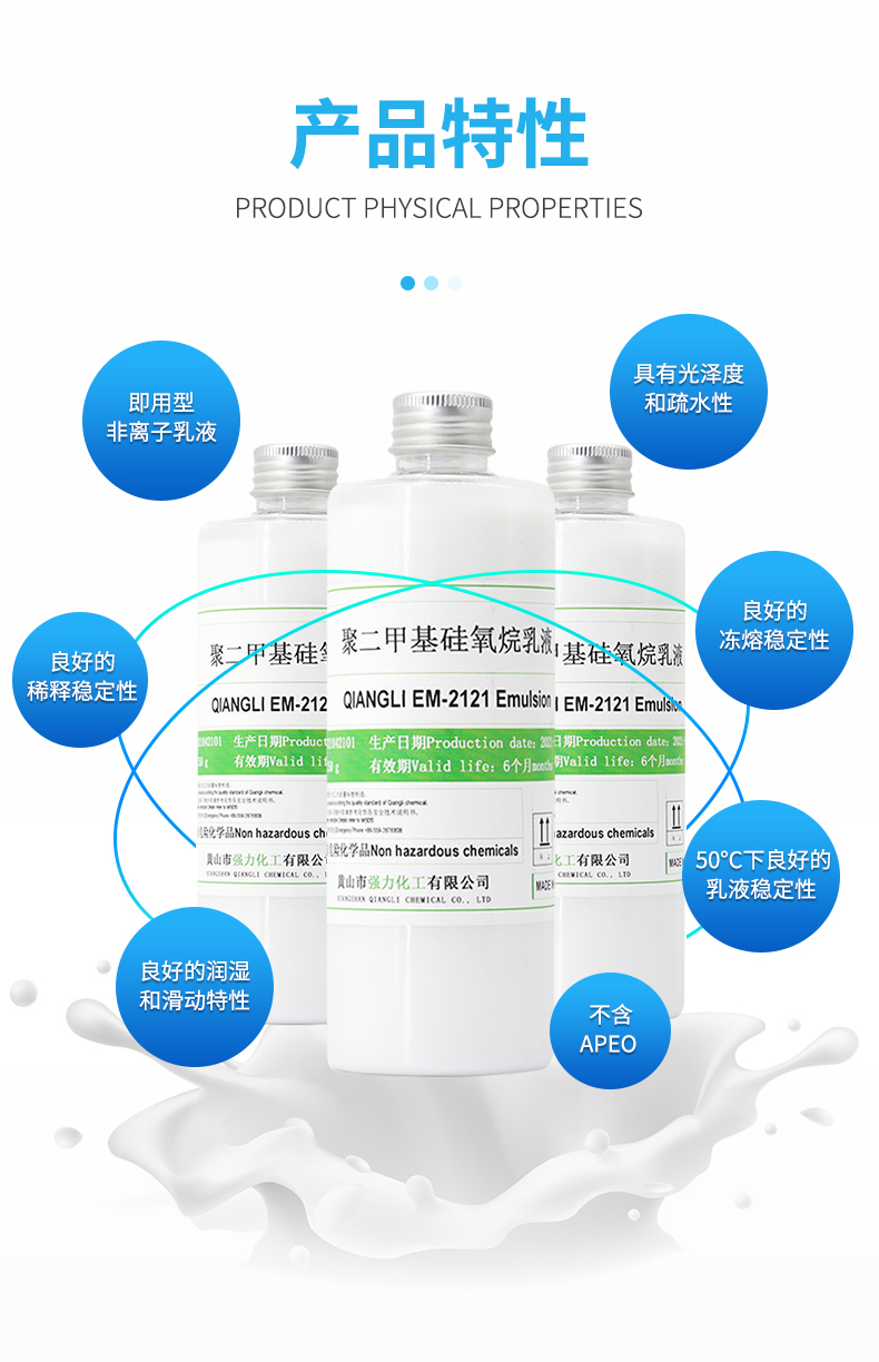 QIANGLI EM-2121 Emulsion是活性含量為60%的非離子聚二甲基硅氧烷乳液,因?yàn)槠浞请x子性,它可廣泛用于各種體系,如非離子,陰離子,陽離子乳化體系或不形成復(fù)合體的聚合物體系,