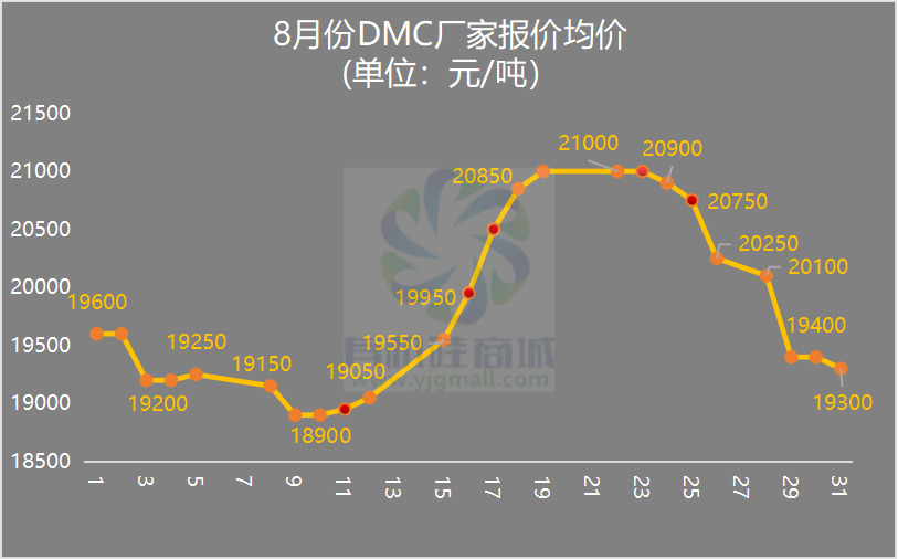 金九銀十的首發(fā)之日,有機硅仍處在上下游博弈階段,DMC在8月先跌后漲再走跌,價格走勢呈倒N字形。8月行情基本可以分三個階段:上旬,難敵需求施壓,龍頭單體廠DMC跌至18800元/噸,隨即封盤拉漲,刺激一波下游抄底備貨。中旬受原料金屬硅大漲提振,國內(nèi)單體廠借勢延續(xù)拉漲,DMC在8月19日沖至21000元/噸;臨近月末,終端需求持續(xù)萎縮,市場避險情緒再起,同時金屬硅也重啟連跌模式,DMC又回到月初低點,截止31日 ,山東單體廠DMC跌至18800元/噸。今日9月1日,持穩(wěn)開盤!