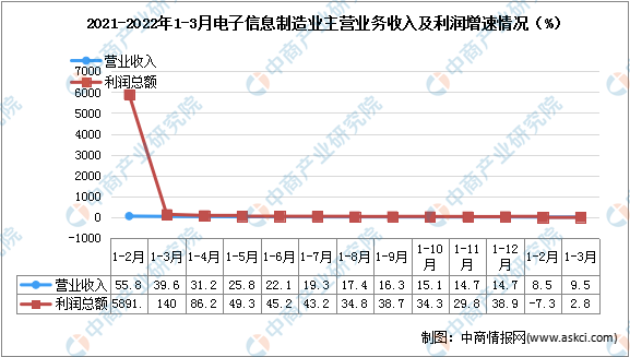 2022年一季度,規(guī)模以上電子信息制造業(yè)實(shí)現(xiàn)營業(yè)收入33791億元,同比增長9.5%,增速比1—2月份高1個(gè)百分點(diǎn),比同期工業(yè)營業(yè)收入增速低3.2個(gè)百分點(diǎn);營業(yè)成本29546億元,同比增長10.2%;實(shí)現(xiàn)利潤總額1433億元,同比增長2.8%,扭轉(zhuǎn)1—2月份負(fù)增長態(tài)勢,營業(yè)收入利潤率為4.2%。