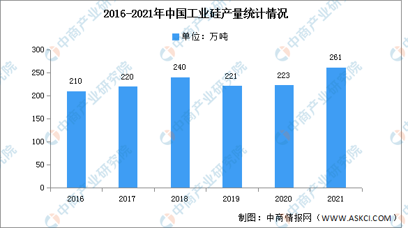 近年來,我國為達(dá)碳中和、碳達(dá)峰的目標(biāo),可再生能源化轉(zhuǎn)型勢在必行,從而也帶動(dòng)了工業(yè)硅市場。2021年,我國工業(yè)硅行業(yè)總體運(yùn)行平穩(wěn),行業(yè)供需兩旺,價(jià)格大幅上漲。2021年,中國工業(yè)硅產(chǎn)量261萬噸,同比增長24.3%。