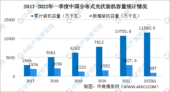 2021年分布式光伏裝機(jī)容量達(dá)到1.08億千瓦,突破1億千瓦,約占全部光伏發(fā)電并網(wǎng)裝機(jī)容量的三分之一。分布式光伏新增約2927.9萬千瓦,約占全部新增光伏發(fā)電裝機(jī)的55%,歷史上首次突破50%。2022年一季度分布式光伏裝機(jī)容量1.16億千瓦,占光伏總裝機(jī)比重36.4%,與上季度相比提升1.2個(gè)百分點(diǎn)。新增裝機(jī)容量887萬千瓦,同比增長192%,新增分布式光伏占全國新增光伏裝機(jī)總量的67.1%,同比提升12.5個(gè)百分點(diǎn)。