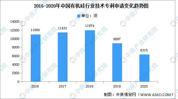 數(shù)據(jù)顯示,2016-2018年我國有機(jī)硅行業(yè)技術(shù)專利申請數(shù)量穩(wěn)定增加,2019年開始有所下降,2020年我國有機(jī)硅行業(yè)技術(shù)專利申請數(shù)量為6315項(xiàng)。