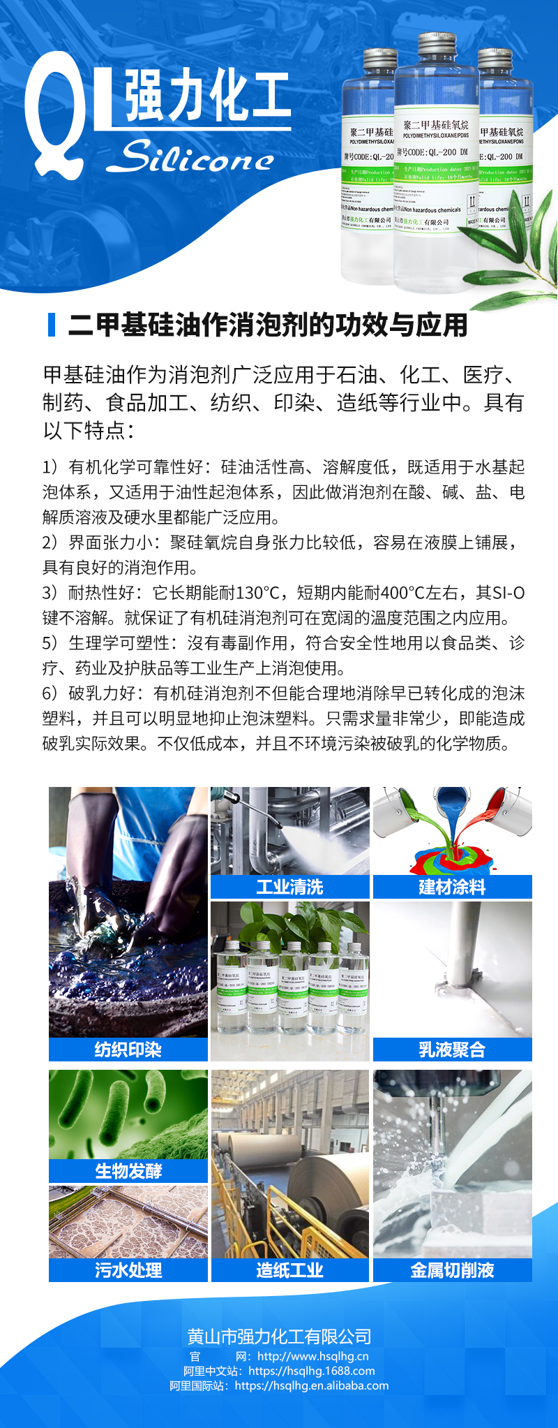 消泡劑(英文名稱Defoamers,Defoaming Agent)是一種助劑,其功能是消除在生產(chǎn)過程中物料形成的泡沫,有機(jī)硅消泡劑(英文名稱organic silicon defoamer)其主要組分為叫做硅油有機(jī)硅成分,硅油常溫下是不揮發(fā)的油狀液體,在水、動(dòng)植物油及礦物油中不溶,或溶解度很小,既能耐高溫,也能耐低溫?;瘜W(xué)性能惰性,物理性性能穩(wěn)定,無生物活性。