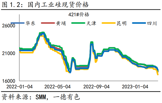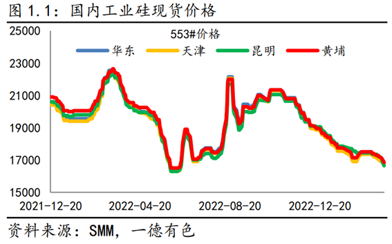 2022年12月22日工業(yè)硅商品期貨成功上市,在春節(jié)前消費疲軟的基本面情況下上市前兩個交易日內(nèi)工業(yè)硅現(xiàn)貨價格從19700元/噸下跌至17000元/噸,但現(xiàn)貨市場表現(xiàn)平穩(wěn)回落報價并未跟隨期貨價格波動,期貨價格宣泄情緒后開始反彈。但新進期現(xiàn)貿(mào)易商的參與打破了原有工業(yè)硅行業(yè)的貿(mào)易模式及現(xiàn)貨市場供需格局,春節(jié)后新進貿(mào)易商現(xiàn)貨市場積極采購緩解了廠家的銷售壓力,現(xiàn)貨市場出現(xiàn)為期一周短暫的反彈。但終端實際消費除了多晶硅需求平穩(wěn)外,有機硅及鋁合金仍處于放假期間采購積極性不高,尤其有機硅行業(yè)依舊面臨全行業(yè)虧損的情況,復產(chǎn)復工積極性不高。在弱消費顯示的情況下,期現(xiàn)貨價格同步下滑,且由于期現(xiàn)貿(mào)易商的拋售使得價格出現(xiàn)了踩踏行為,3月底期貨價格跌破16000元/噸,跌破部分企業(yè)生產(chǎn)現(xiàn)金流成本,南方地區(qū)工廠出現(xiàn)新一輪的減產(chǎn)行為,且復產(chǎn)計劃頻頻推遲。西南供給端收縮明顯,但西北新增產(chǎn)能投放如常,造成一季度全國產(chǎn)量大幅度走高,對市場價格形成壓力。