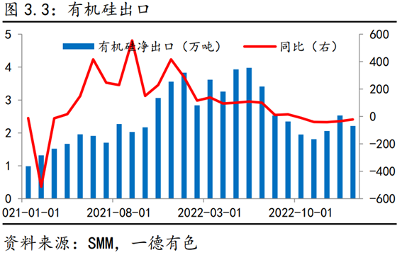 1-2月份有機硅凈出口4.74萬噸,同比下滑29%,凈出口量自2022年下半年開始下滑也與海外消費衰退相吻合,且目前了解傳統(tǒng)消費旺季出口依舊疲軟,預計2023年有機硅凈出口量30萬噸左右,同比減少17%。