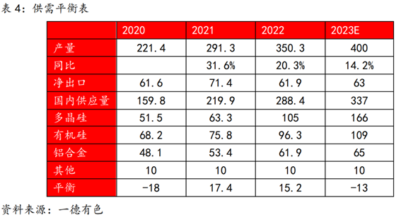 2023年預計工業(yè)硅產(chǎn)量400萬噸,同比增長14.2%左右,2023年工業(yè)硅凈出口預估63萬噸,多晶硅消費大幅度提升至166萬噸,有機硅行業(yè)預估消費量109萬噸,全年國內(nèi)消費350萬噸,增速28%,全年緊缺13萬噸,不過由于多晶硅產(chǎn)量釋放周期長,因此預計2023年上半年工業(yè)硅仍將面臨壓力。