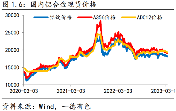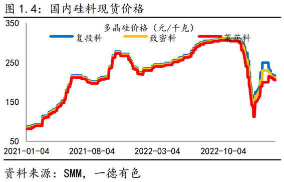 有機硅的行業(yè)洗牌仍在繼續(xù),2022年有機硅行業(yè)產(chǎn)量同比增長超20%,但開工率卻呈現(xiàn)下降確實,隨著過去一年新增產(chǎn)能的達產(chǎn)釋放,2023年1-2月份中國有機硅產(chǎn)量更是創(chuàng)出新高,開工率也隨之增加,但行業(yè)平均利潤卻依舊面臨虧損狀態(tài)。終端地產(chǎn)、汽車等行業(yè)消費不佳,市場情緒趨弱采購積極性不高,造成有機硅價格修復缺乏動力。多晶硅行業(yè)利潤豐厚行業(yè)開工率始終維持頂部區(qū)間,因此對工業(yè)硅的消費存在保障。多晶硅雖然供應過剩的局面不改且價格出現(xiàn)回落,但受迫于多晶硅行業(yè)技術壁壘較高導致全行業(yè)利潤保持在多晶硅板塊。受海外宏觀風險持續(xù)不斷造成電解鋁價格持續(xù)萎靡低位震蕩,鋁合金市場價格也隨之波動,且隨著廢鋁使用量的增加,合金行業(yè)對工業(yè)硅需求保持平穩(wěn)且看不到向上的驅(qū)動。