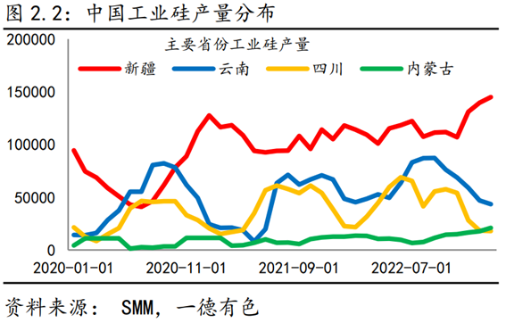 據(jù)SMM數(shù)據(jù)統(tǒng)計2023年1-2月份中國工業(yè)硅產(chǎn)量55.48萬噸(不包含97硅和再生硅),累計同比增長13.7%,2月份在生產(chǎn)周期僅為28天的情況下產(chǎn)量依舊環(huán)比增長2.6%。從分區(qū)域數(shù)據(jù)來看,產(chǎn)量貢獻來源于新疆和內(nèi)蒙地區(qū),1-2月份新疆地區(qū)產(chǎn)量28.47萬噸,累計同比增長22.5%,內(nèi)蒙地區(qū)產(chǎn)量3.87萬噸,累計同比增長47.7萬噸,內(nèi)蒙地區(qū)主要源于鑫元硅材的產(chǎn)量貢獻。