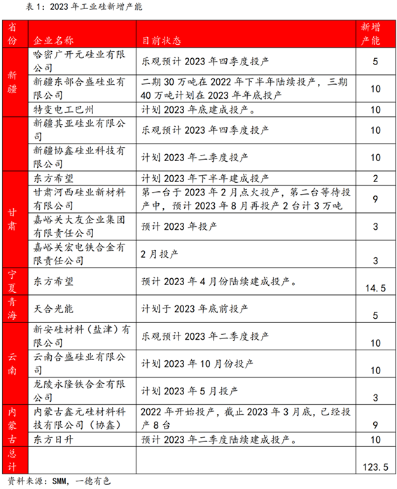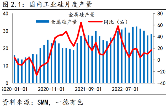 2023年1-2月份中國工業(yè)硅產(chǎn)量55.48萬噸(不包含97硅和再生硅),累計同比增長13.7%,預計3月份國內(nèi)工業(yè)硅產(chǎn)量30-31萬噸,4月產(chǎn)量約29萬噸,日均產(chǎn)量較2月份減少5%。2023年新增產(chǎn)能或達到123.5萬噸,全年預計產(chǎn)量400萬噸,同比增長14.2%。