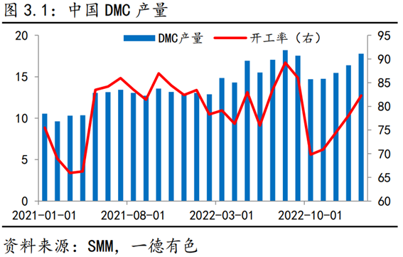 據(jù)統(tǒng)計2023年1-2月份中國DMC產(chǎn)量34.18萬噸,累計同比增長31.8%,2022年底由于下游消費疲軟,有機硅企業(yè)進行主動的檢修減產(chǎn),開工率及產(chǎn)量均出現(xiàn)了明顯的下滑。2023年春節(jié)后,隨著疫情的放開市場情緒的好轉(zhuǎn),終端消費復蘇有機硅行業(yè)成本庫存壓力減小,價格有所回升,但漲勢并未持續(xù),小企業(yè)受迫于生存壓力出現(xiàn)降價賣貨的情況。行業(yè)洗牌依舊持續(xù),新疆合盛持續(xù)投產(chǎn),個別小企業(yè)負荷仍在降低,不過市場整體貨源供應持續(xù)增加。