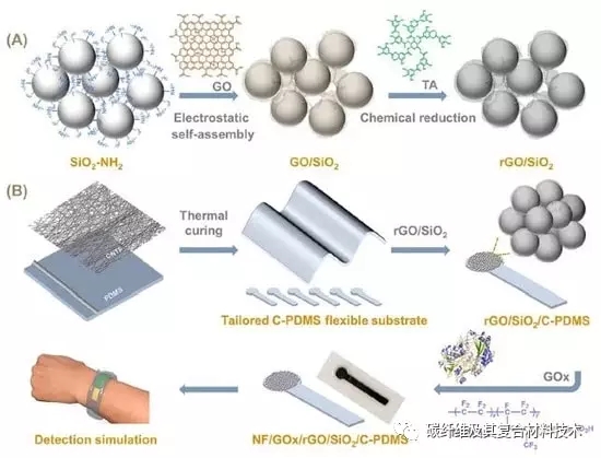 此外,它還可以引入更多的二次傳感材料,從而增強(qiáng)其多功能化能力。使用沉積在碳納米管(CNT)和PDMS復(fù)合基底上的rGO涂層二氧化硅(SiO2)納米球、葡萄糖氧化物和Nafion溶液檢測汗液中的葡萄糖?;瘜W(xué)電阻氣體傳感器由rGO和氧化鋅(ZnO)納米棒制成。