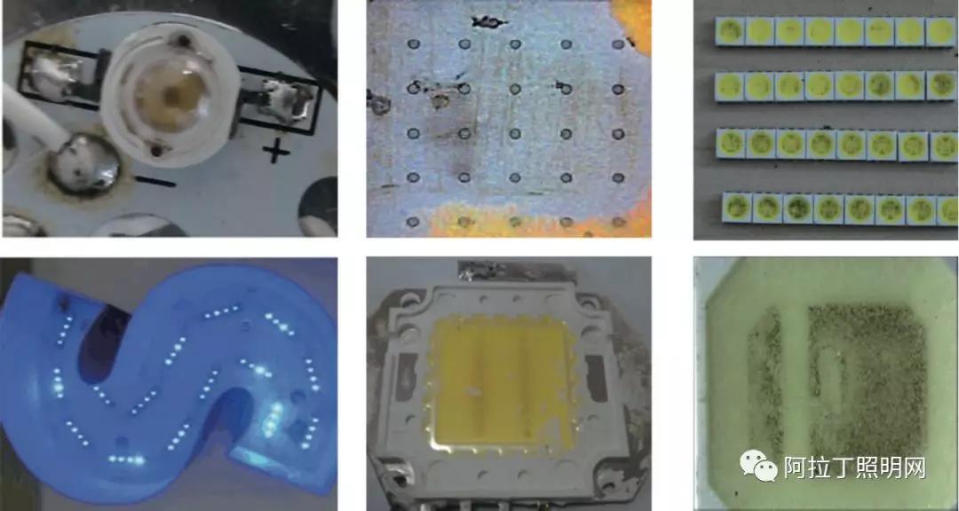 從圖一可以看到,不論燈珠形式,不論何種燈具,硫化發(fā)黑和鹵素發(fā)黑是LED終端經(jīng)常會(huì)遇到一個(gè)問(wèn)題,通常是LED支架反射銀層與環(huán)境中硫元素或者鹵素發(fā)生化學(xué)反應(yīng)引起的外觀發(fā)黑,這種發(fā)黑通常不可逆,造成非常大的光衰。