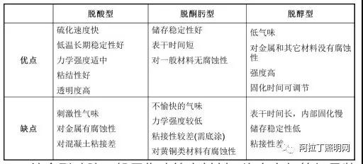 根據(jù)交聯(lián)反應(yīng)生成的副產(chǎn)物種類,縮合型硅膠又可以細(xì)分為脫酸型、脫酮肟型、脫醇型、脫胺型、脫丙酮型、脫酰胺型等六種類型,常見(jiàn)的三類縮合型硅膠的優(yōu)缺點(diǎn)如下所示。